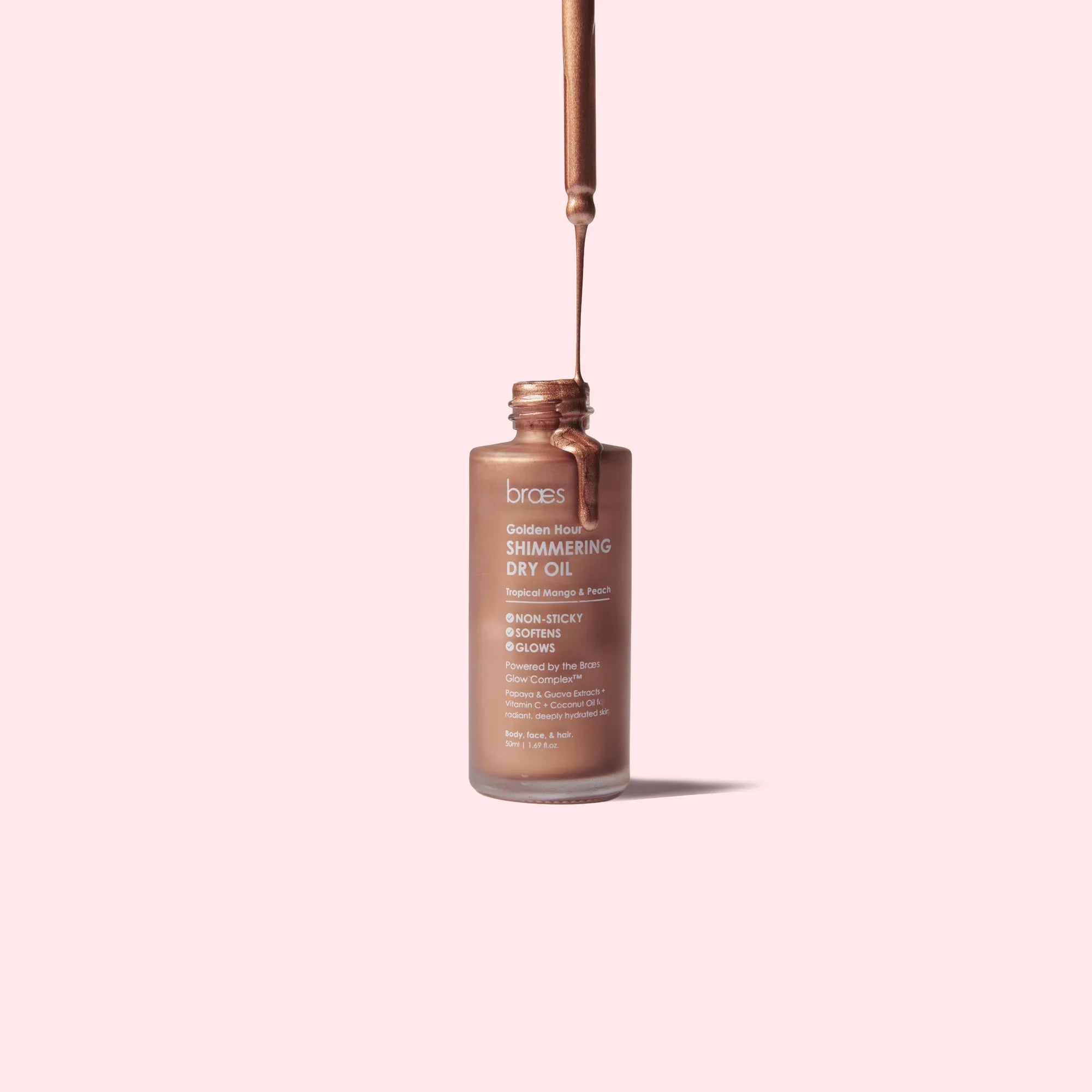 A: 100%. It’s made for face, body, and even hair. It’s skincare-graded and powered by the Braes Glow Complex™, so go ahead—dab it on your cheekbones, collarbones, or even through the ends of your hair for that shimmer moment.